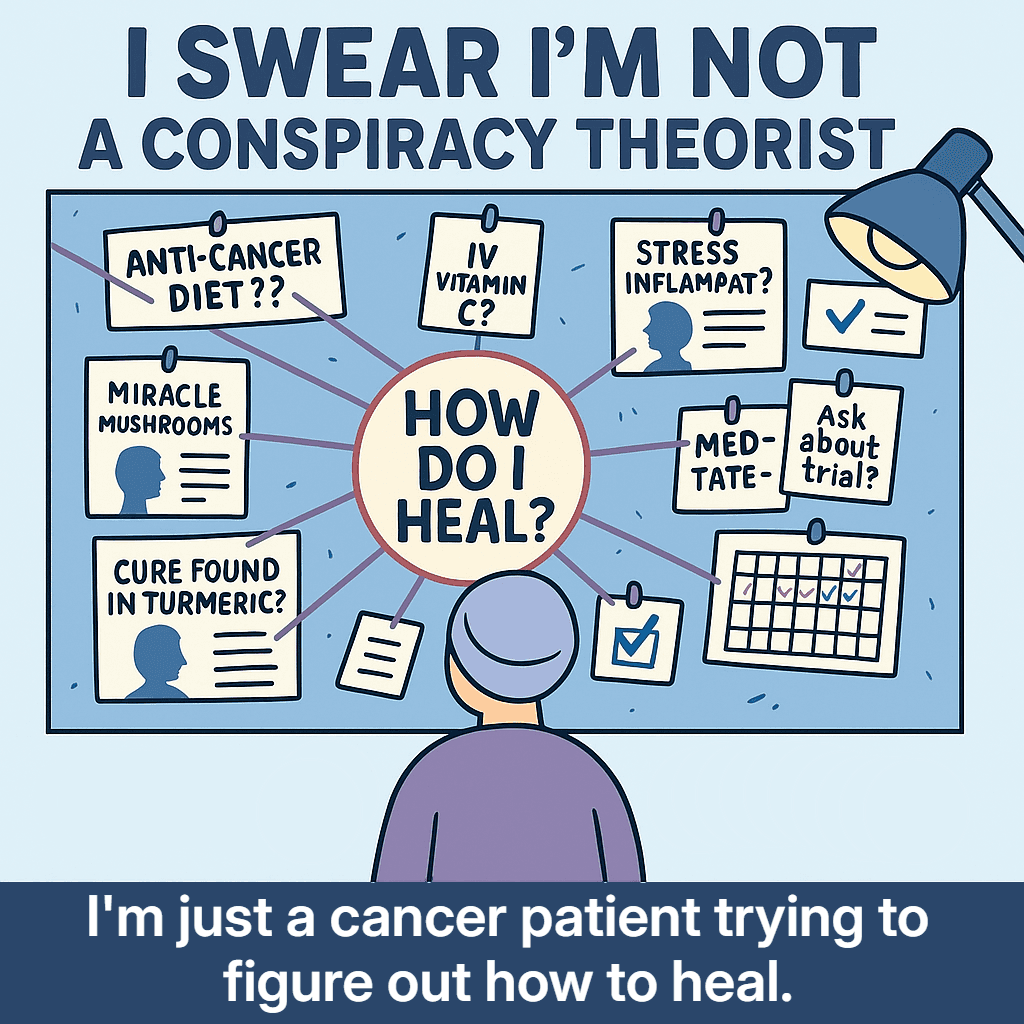 Cancer humor thrives in the chaos of medical guesswork — that frantic space where you’re not spiraling, you’re simply trying to stay alive while Google turns you into a part-time detective with a wall of red yarn.