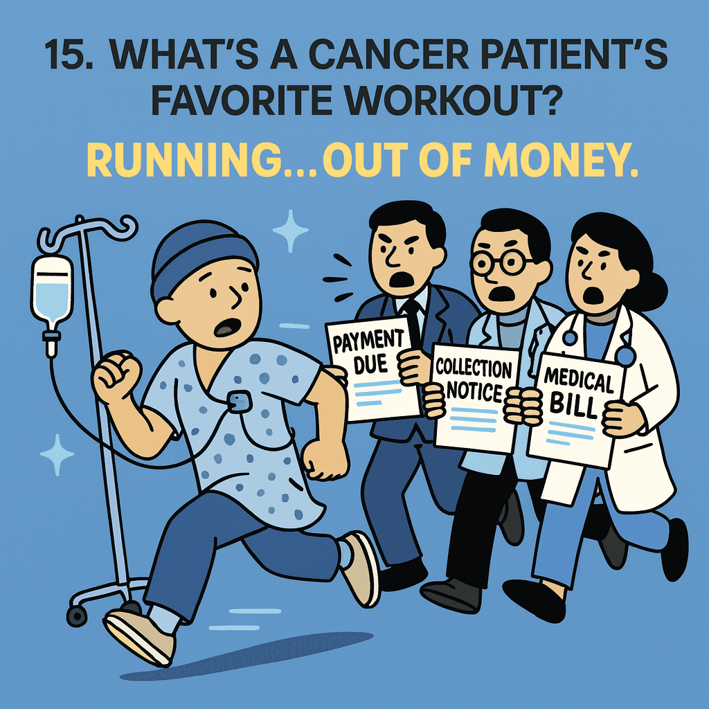 Cancer humor lands best when it turns survival into sport — and this joke transforms the financial sprint of treatment into the world’s least glamorous marathon.