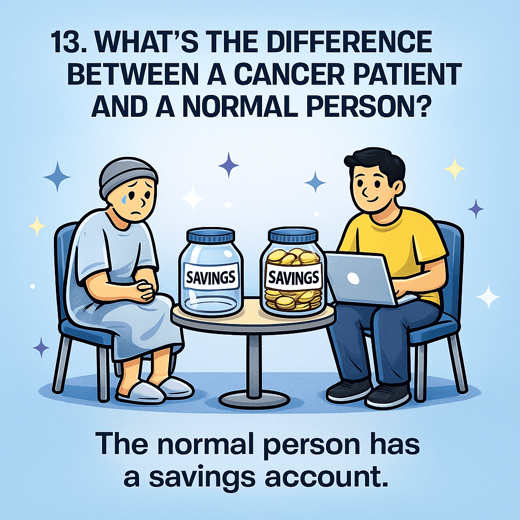 A “normal” person sits comfortably with a healthy savings jar, while the cancer patient’s jar is… well… empty.